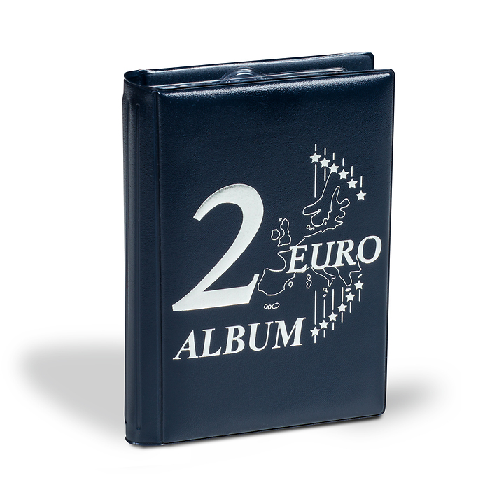Album de poche très pratique pour classer 48 pièces de 2 euros et les emporter sur une bourse d’échange. 6 feuilles avec des bandes d’insertion en PVC sans acide pour classer 8 pièces de 2 euros par feuille. Reliure ouatinée de couleur bleu foncé et impression d’un motif couleur argent.
