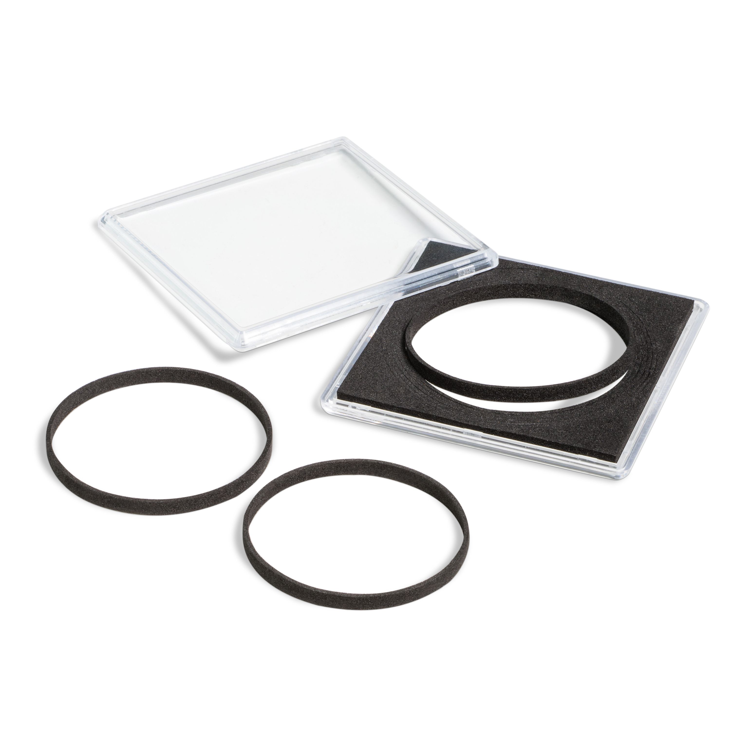 Capsules pour classer des différentes pièces et médailles grandes dans un seul système. Avec 8 anneaux de séparation amovibles permettant de loger des monnaies et médailles avec un diamètre de 42 à 58 mm et une hauteur maximale de 4,5 mm. Anneaux en mousse noire (sans plastifiant acide). Format extérieur : 67,25 x 67,25 x 7,8 mm. Paquet de 5.