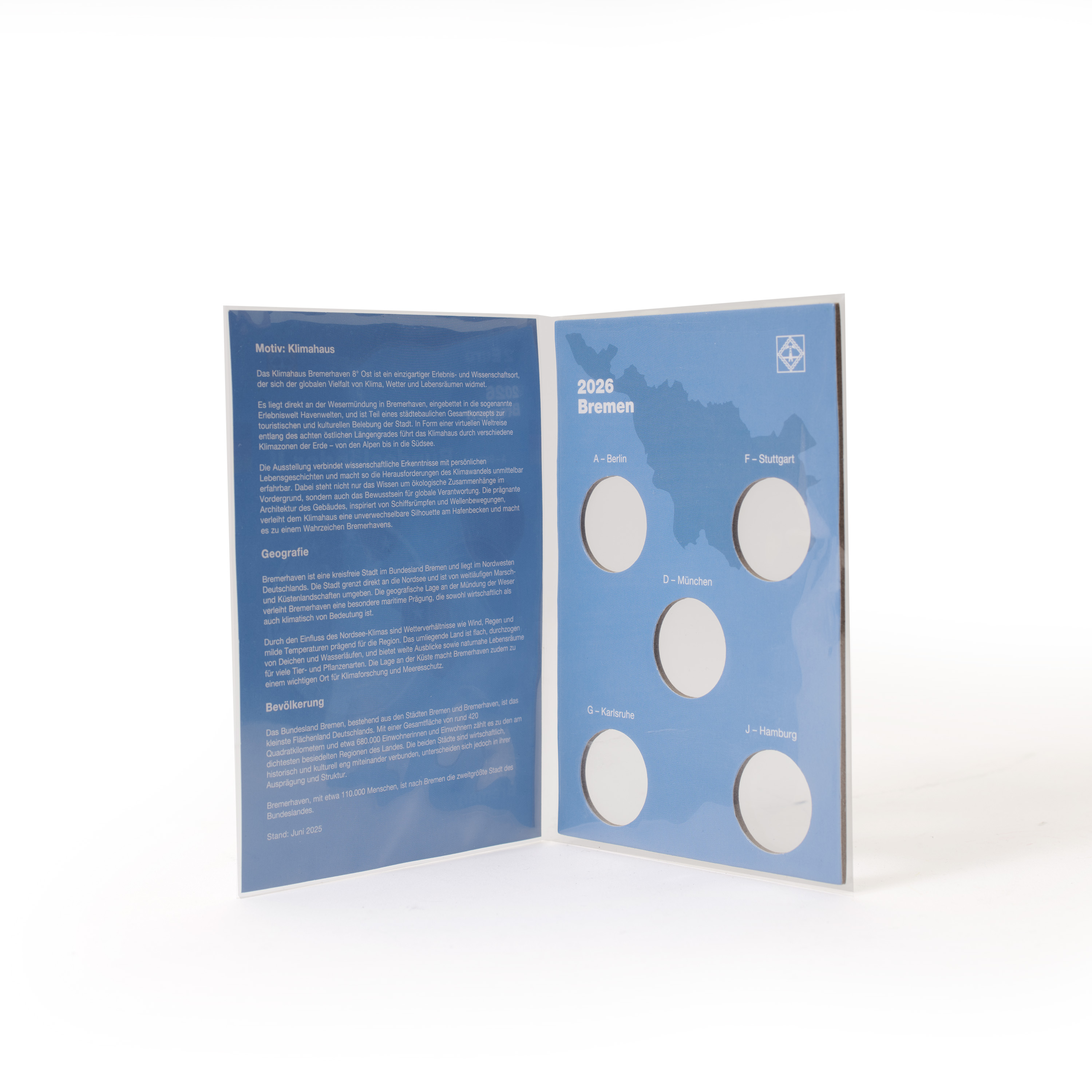 Carte de collection en carton solide avec découpes pour les cinq pièces commémoratives allemandes de 2 euros « Klimahaus Bremerhaven » (Maison du climat de Bremerhaven) de 2025 (marques d'atelier A, D, F, G et J). Les pièces sont placées dans un film plastique transparent, sans plastifiant, qui permet de voir leurs deux faces. La carte contient également des informations de fond et des illustrations sur les pièces. Dépliée, la carte mesure 212 x 144 mm ; repliée, elle a une taille pratique de 106 x 144 mm – idéale aussi comme emballage cadeau.