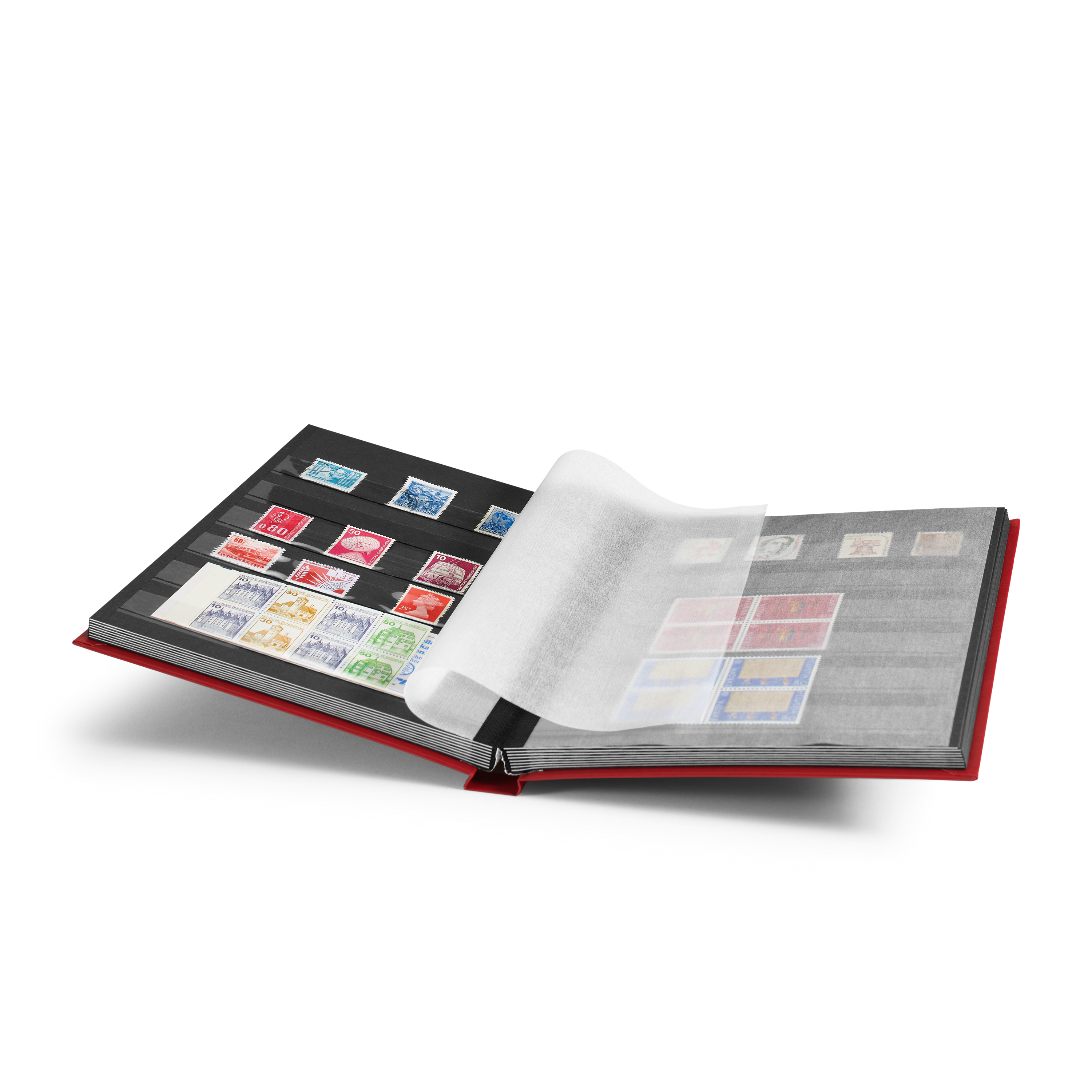 Classeurs pour timbres BASIC en format A5*, 32 pages blanches, couverture non ouatinée. 6 intercalaires cristal, 6 bandes rhodoïd/ page. Articulation rigide. Couleur: Rouge.