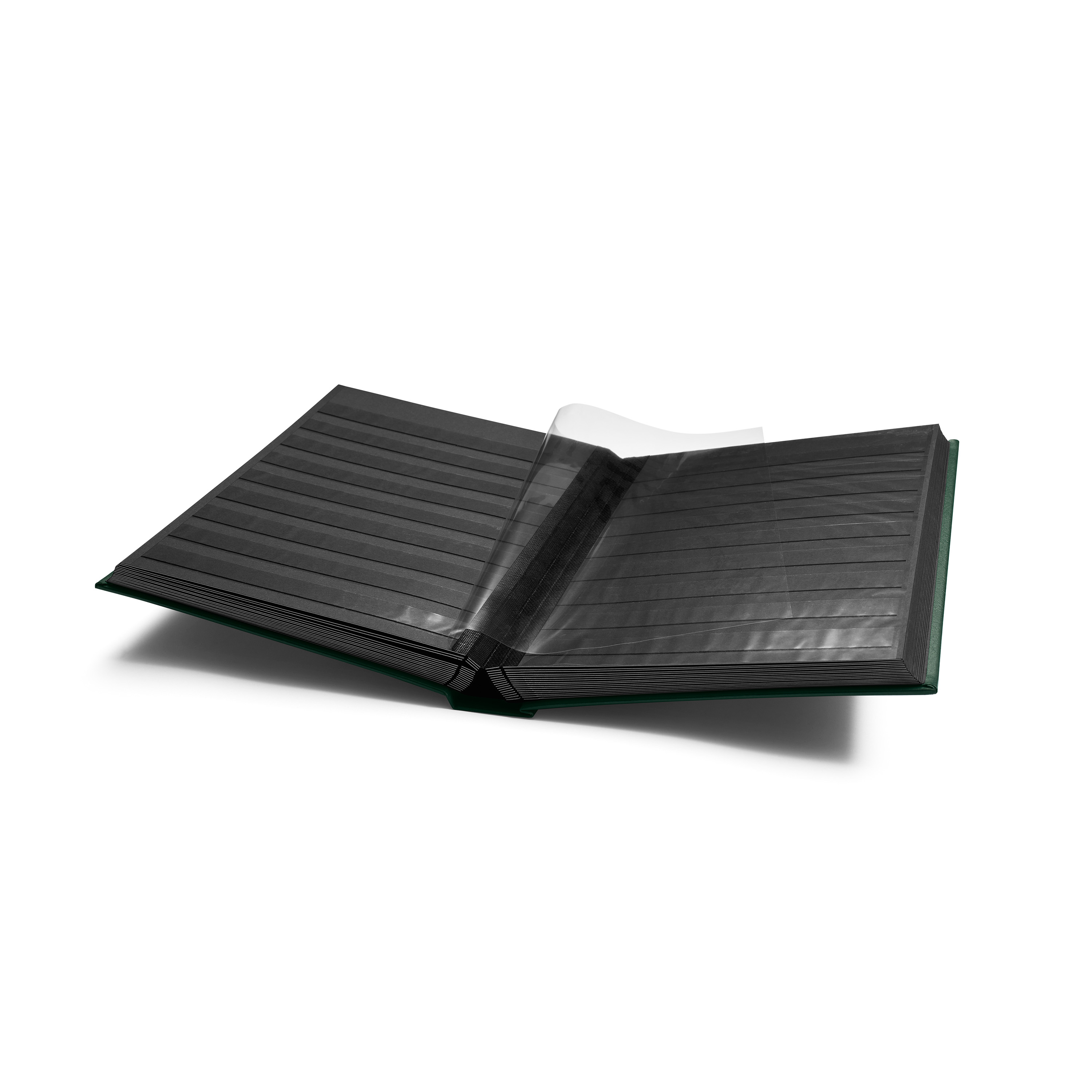 Classeure en format A4 PREMIUM avec 64 pages noires. Couverture ouatinée cuir, double articulation toilée. Matériau des bandes: feuille spéciale sans acide ni plastifiant. Sans étui de protection. Couleur: Vert.