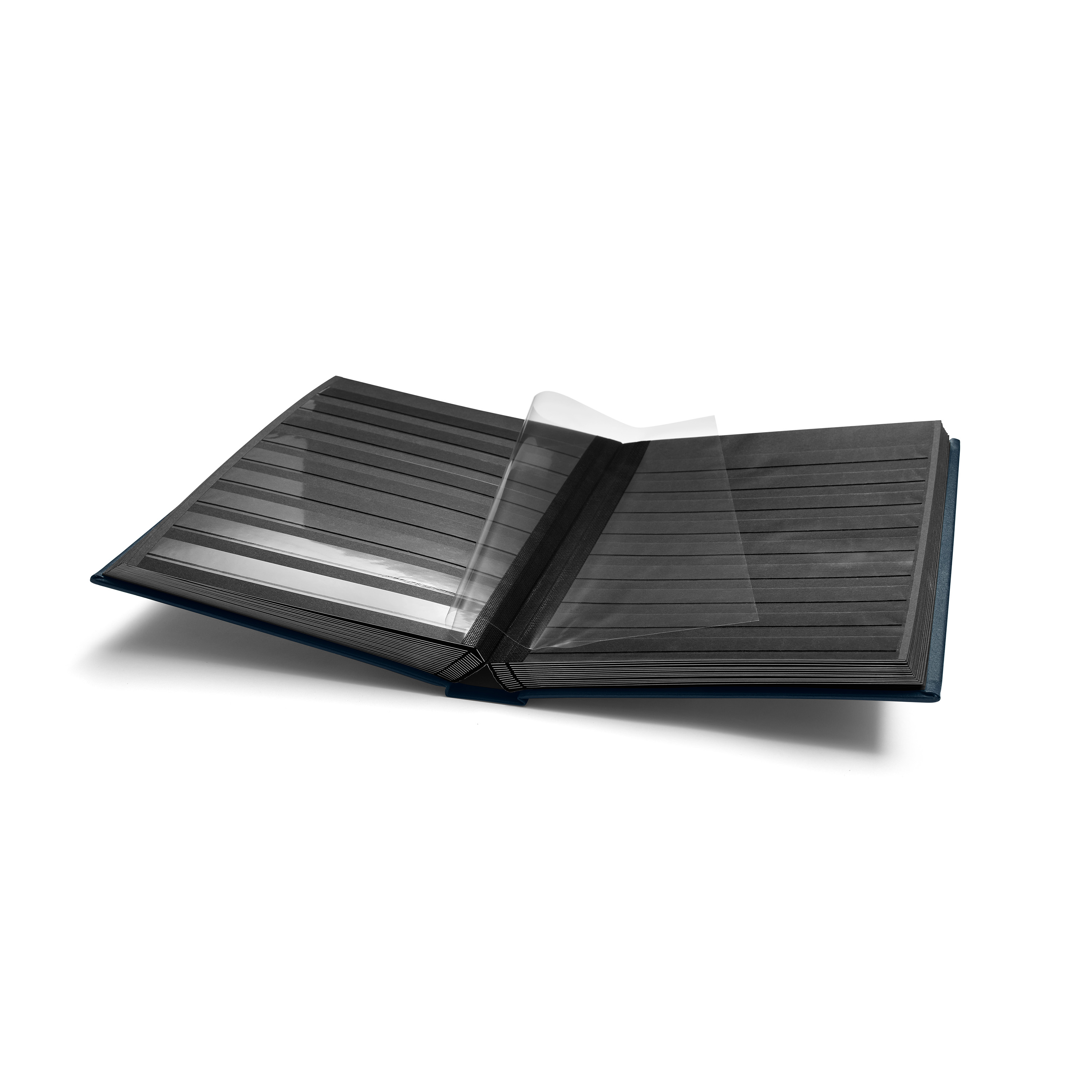 Classeure en format A4 PREMIUM avec 64 pages noires. Couverture ouatinée cuir, double articulation toilée. Matériau des bandes: feuille spéciale sans acide ni plastifiant. Sans étui de protection. Couleur: Bleu.