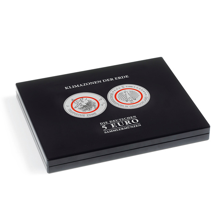 Cet élégant coffret noir est particulièrement adapté pour classer toutes les 25 pièces de collection allemandes de 5 euros de la série « Zones climatiques de la Terre » (ateliers A, D, F, G, J) en capsules (Ø intérieur 27 mm). 1 plateau avec fond recouvert de feutrine noire et 25 cases rondes (Ø 33 mm). Superbe impression du motif « Zone tropicale » sur le couvercle (en plusieurs couleurs) et à l’intérieur (en une couleur). L’intérieur du couvercle est tapissé de satin noir. Fermeture par aimant.