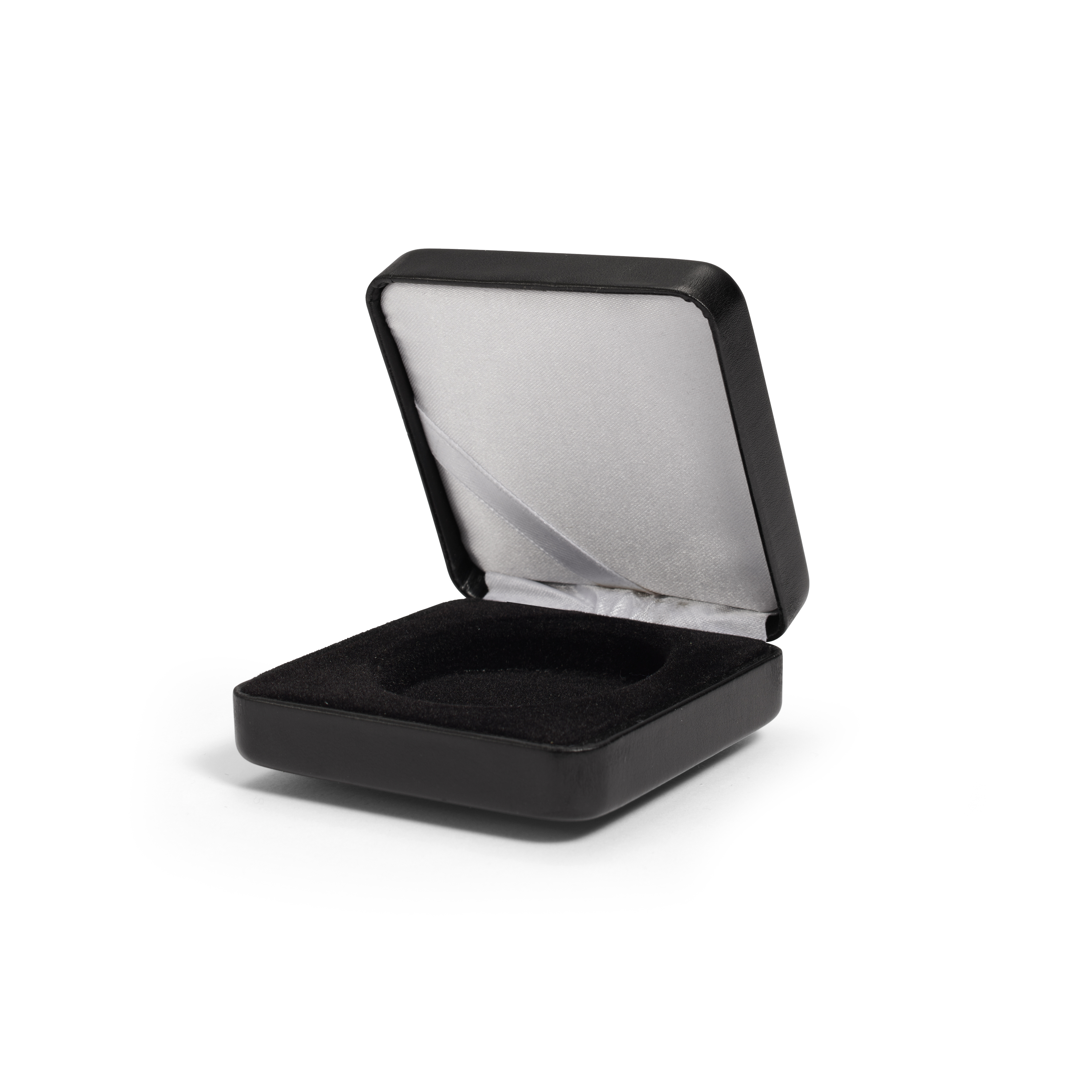 L'étui en métal permet de loger de manière très élégante vos pièces de collection sous capsule. Le tissu intérieur mat ressemblant à du cuir ainsi que l'insertion recouverte de feutrine donne à cet étui un caractère très raffiné. Vous trouverez dans le couvercle intérieur un ruban de satin permettant de loger un éventuel certificat. De par sa robustesse, l'étui en métal est parfaitement adapté à l'envoi de pièces par correspondance. Dimensions: 65 x 65 x 26 mm