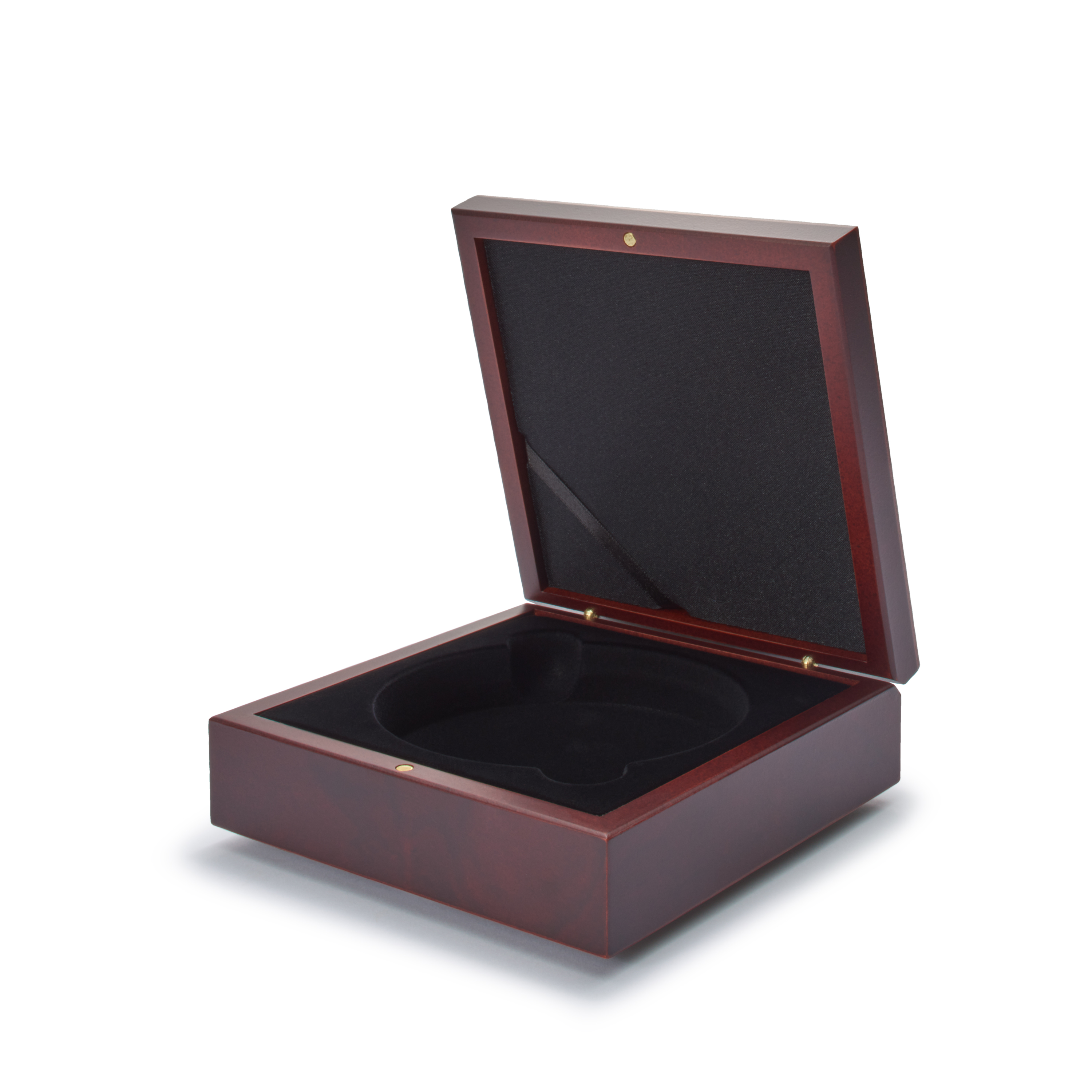 Ecrin à monnaies VOLTERRA en façon acajou pour 1 capsule GRIPS XL 53–101. Couvercle est recouvert de satin noir. Fonds en velours noir avec une case (Ø 111,5 mm). Bandeau de satin inclu pour fixer un certificat éventuel. Format extérieur : 150 x 150 mm.