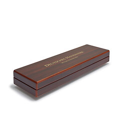 Ecrin façon acajou pour classer les 5 pièces allemandes de 50 euros d’or de la série «Deutsches Handwerk» 2023 – 2027 en capsules d’origine. Fond avec 5 cases dans une feutrine rouge. Impression du thème spécifique sur le couvercle et à l’intérieur. L’intérieur du couvercle est tapissé de satin rouge. Avec un ruban pour maintenir un certificat. Système de fermeture discret par aimants.