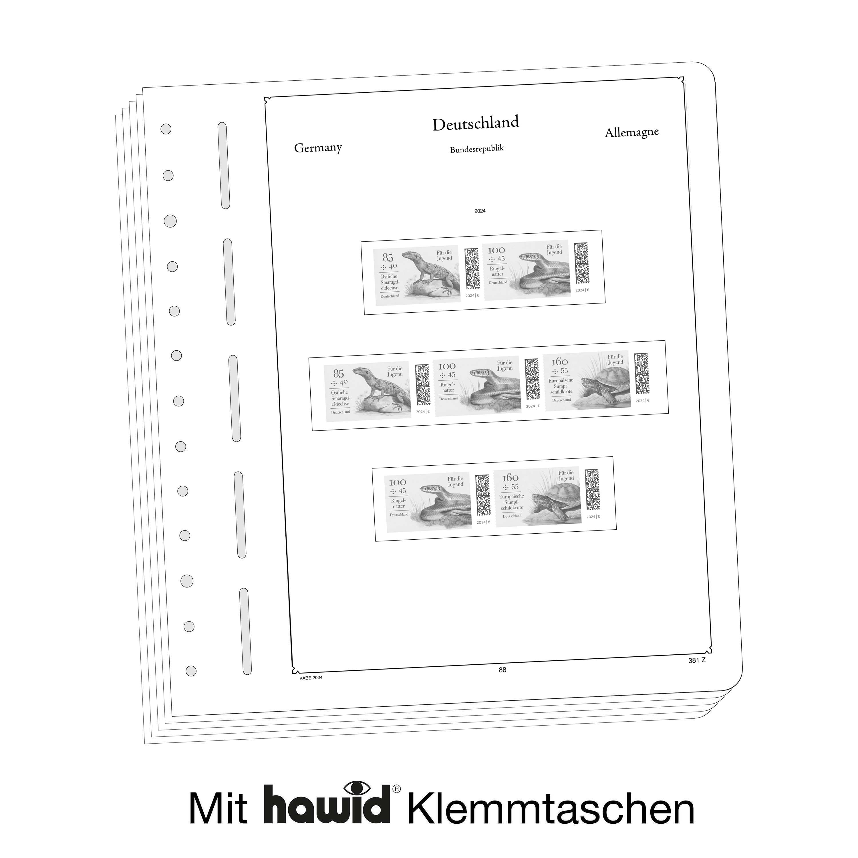 Les feuilles KABE (format 275 x 310 mm) sont imprimées par offset, en noir et blanc, avec un grand souci de précision, sur du papier stable, sans bois ni acide (175 g/m 2 ). Nous renonçons volontairement à une impression en couleurs. Vous pouvez ainsi plus facilement savoir quels timbres manquent encore dans votre album. Des pochettes de protection, fabriquées à partir d'une feuille de polystyrène traitée anti-reflet, transparente et sans plastifiant acide, découpées au format des différents timbres, sont collées sur les pages des albums. Les pochettes de protection maintiennent les timbres bien en place, sans qu'il soit nécessaire de les coller. De plus, elles assurent une protection optimale contre la poussière et divers dommages. La double articulation toilée permet que les feuilles soient toujours bien à plat et durent longtemps.