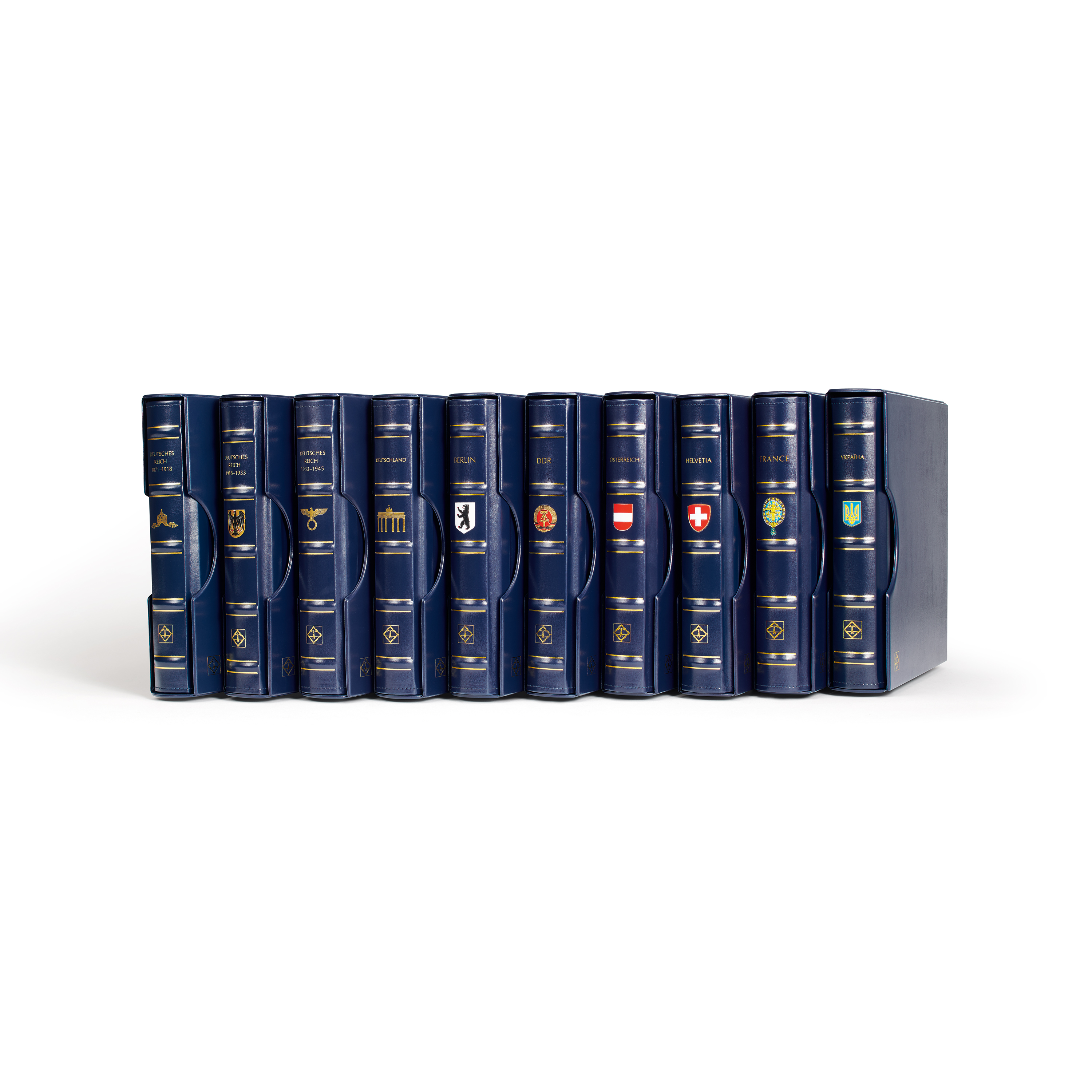 Les célèbres reliures à barre rotative et à anneaux sont désormais disponibles avec impression du pays sur la couverture. Cette présentation élégante et de grande qualité fait de vos albums de timbres ou de documents un ouvrage unique.