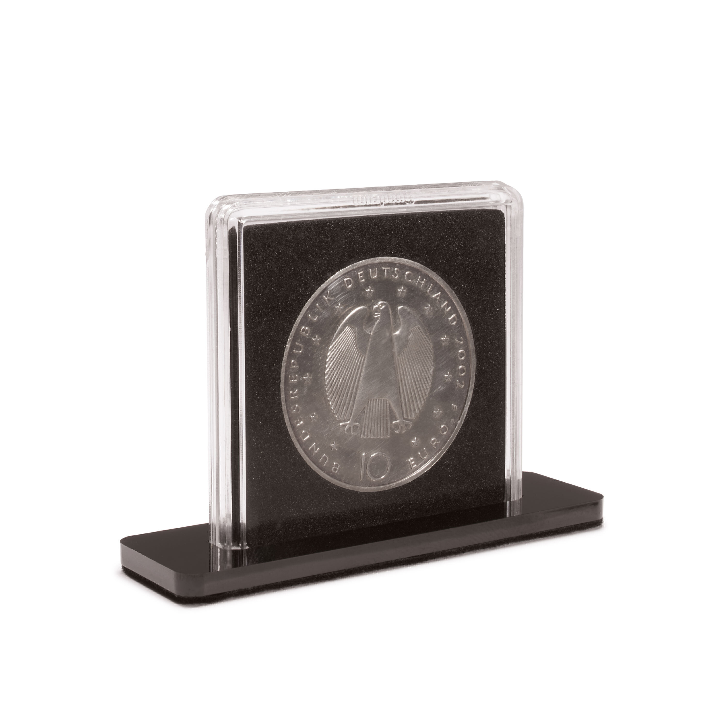 apprécié de conserver en sûreté les pièces et de les présenter sous forme avenante – désormais, il est également possible de placer les capsules rectangulaires pour monnaie à la verticale. Le support pour pièce QUADRUM façon vernis piano élégant constitue un présentoir sobre pour les pièces enfermées dans une capsule QUADRUM. Cette présentation esthétique attirera tous les regards sur chaque vitrine de pièces de collection. La capsule QUADRUM se place facilement sur le support pour pièce et peut être retirée si besoin. Le logement est parfaitement adapté aux capsules QUADRUM."