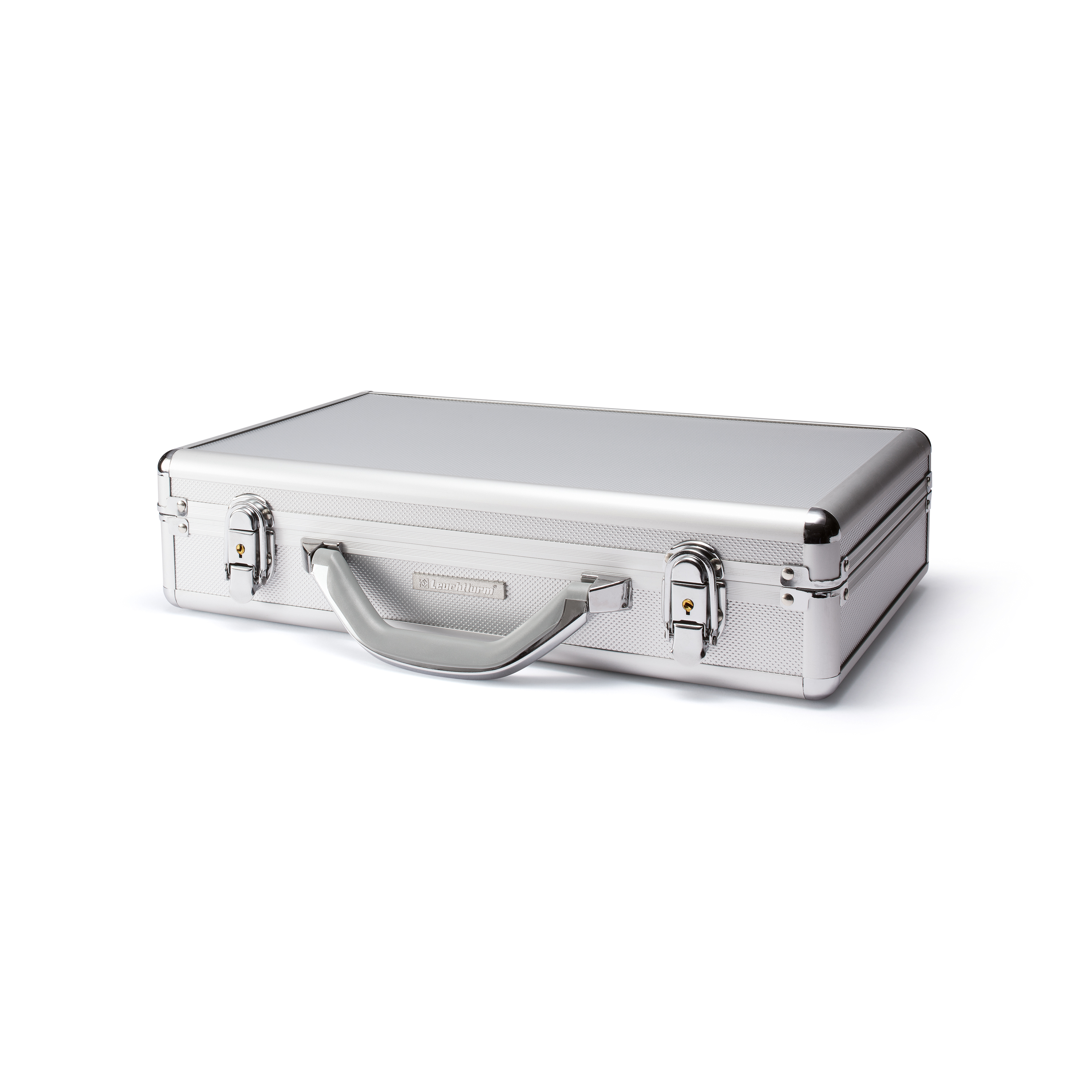 Mallette numismatique en aluminium peut contenir 6 plateaux. Equipment: intérieur entièrement recouvert de velours bleu-marine, très maniable pour retirer les plateaux, à fermoir (2 clés), poignée en plastique ABS, pied en caoutchouc, coins chromés. Format extérieur: 407 x 95 x 245 mm.