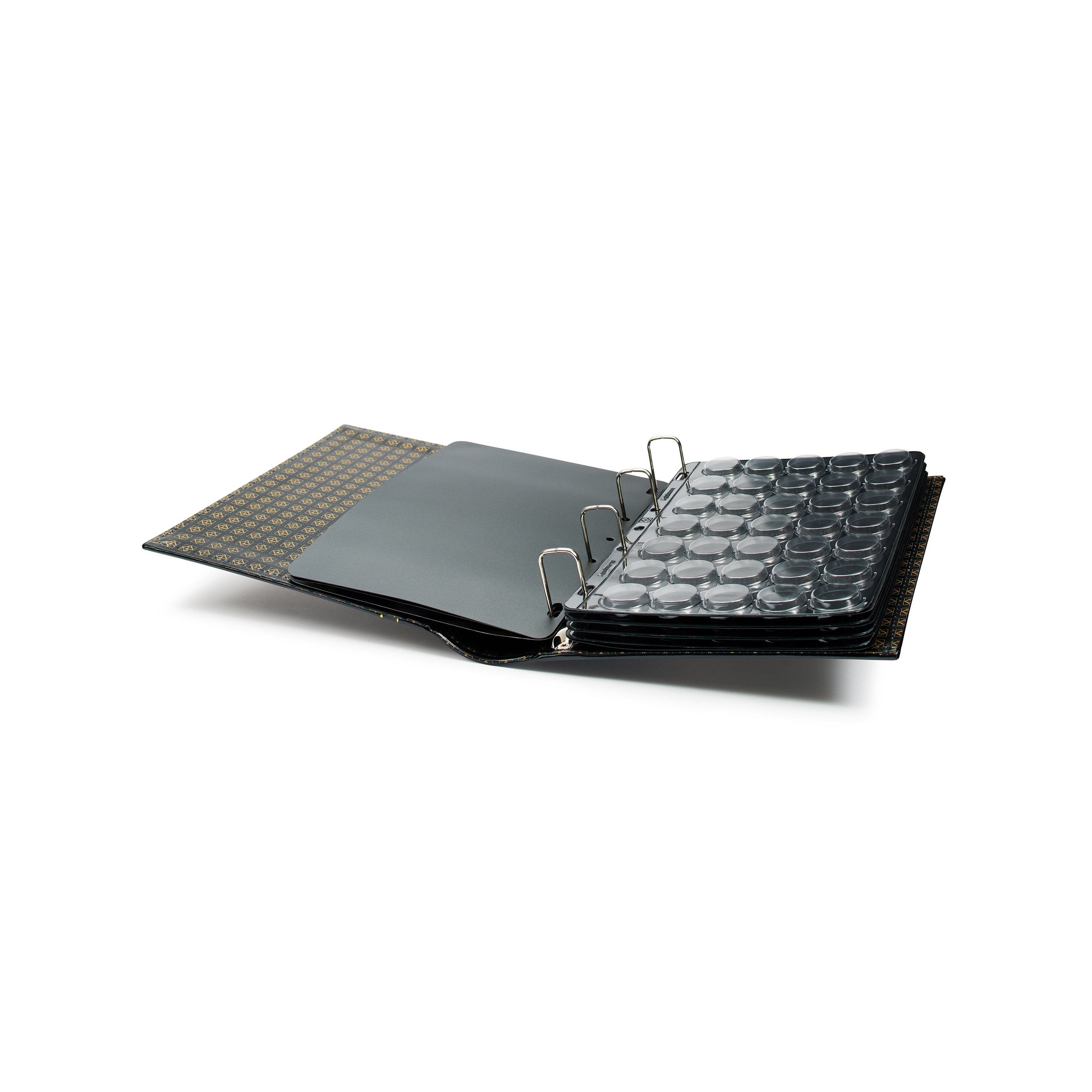 Album livré avex 5 feuilles noires COMART35 pour 175 plaques de muselets de Chapagne et 5 intercalaires noires.Il est possible de compléter l´album en ajoutant des feuilles supplémentaires. Capacité totale: 9 feuilles = 3615 plaques de muselets de Champagne.