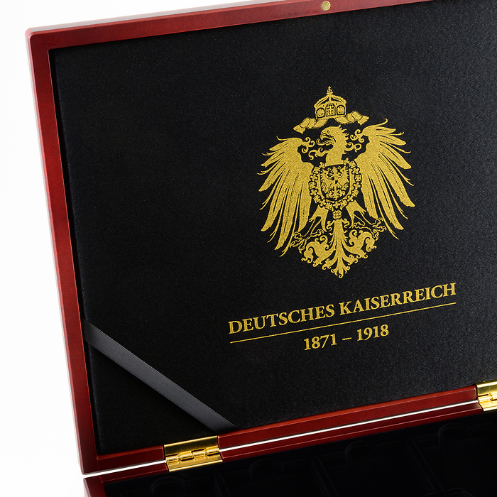 Ce coffret de qualité couleur acajou permet de stocker 20 monnaies de l’Empire Allemand en capsule QUADRUM. Ces monnaies furent créées à l’occasion des 150 ans de l’avènement de l’Empire Allemand en l’an 1871. Un plateau recouvert de feutrine noire avec 20 cases carrées (50 x 50 mm). Elégante impression dorée de l’animal héraldique sur le couvercle. L’intérieur du couvercle est tapissé de satin noir. Système de fermeture sûr et discret par aimants. Format extérieur: 305 x 245 x 30 mm. Les capsules ne sont pas comprises dans la livraison.
